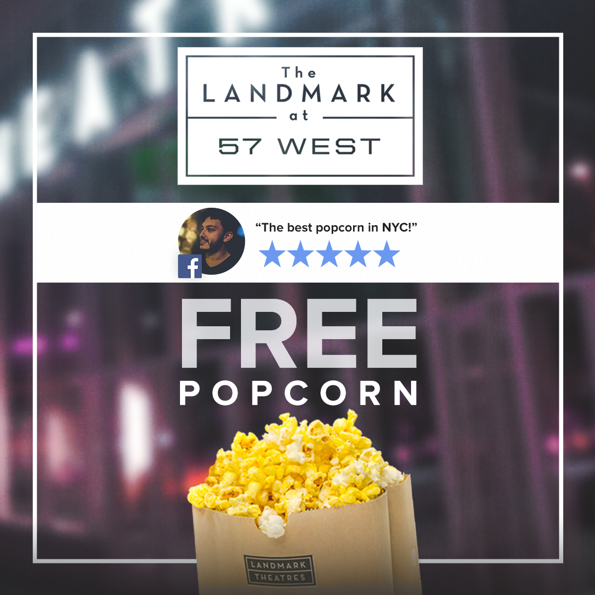 Download Your FREE CouponLandmark is an upscale, contemporary theatre that showcases a wide variety of films, from independent and foreign films to 3D movies and blockbuster hits! Not only that, but you can select from a range of gourmet snacks (like our famous popcorn!) and order a cosmo or craft beer to enjoy. Don’t spend another night at a crowded, loud theatre - indulge in the movie experience you deserve! Visit our theatre at the corner of West 57th Street and 12th Avenue and grab your FREE bag of popcorn, today!